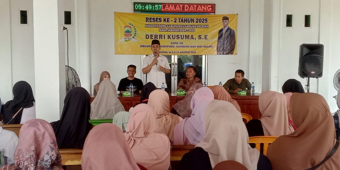 Ungkapselatan.com, Lampung Selatan – Anggota DPRD Kabupaten Lampung Selatan, Derri Kusuma, S.E., menggelar reses kedua tahun 2025 di Desa Bumijaya, Kecamatan Candipuro, Minggu (10/8/2025). Kegiatan tersebut dihadiri Kepala Desa Bumijaya Aris Mustofa, perangkat desa, konten kreator Safitri asal Kecamatan Palas, serta para pelaku Usaha Mikro Kecil Menengah (UMKM).